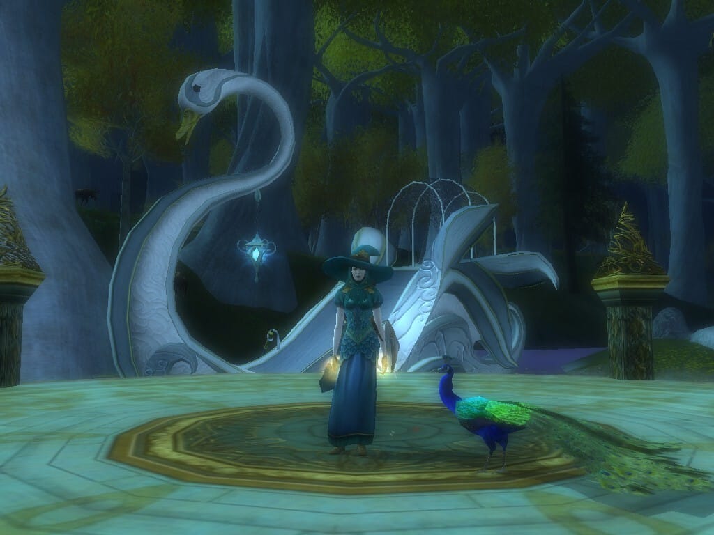 A screenshot of my minstrel character, Aiwelin, in her summer witch garb in the forest of Lothlorien.